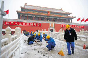 2月18日,工人在天安门金水桥上施工。 为迎接新中国成立60周年,天安门管委会从当日起对金水桥实施保护修缮,工程拟于2009年5月1日前完工,并整体对外开放。 经专家鉴定,金水桥主要存在石质文物风化、桥栏板栏杆局部开裂、桥面石材磨损等问题,亟待保护维修。据悉,此次修缮工作将分阶段进行,由于施工围挡防火板高度有限,因此金水桥和天安门城楼的整体景观和游览不会受到太大影响。 新华社记者金良快摄