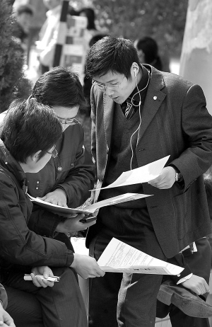 2月21日,几位毕业生在招聘会场外交流信息。当日,山东省应届毕业生春季双选会在济南市国际会展中心举行。200多家招聘企业为求职者提供的6000多个岗位,吸引了数万名应届毕业生前往。由于当天济南市有三场大型招聘会,众多学子不顾疲劳,辗转于三个会场之间寻找就业机会。 新华社记者 朱峥 摄
