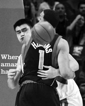 | 姚明(左)与小牛队霍林斯拼抢。