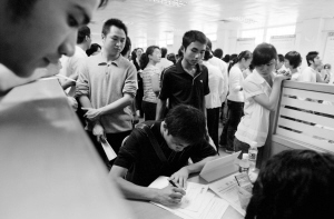| 2月14日,海南省2009年第三届周末人才劳动力招聘会在省人才劳动力市场举行。图为大量应届高校毕业生正在接受应聘单位面试。 海南日报记者 张杰 摄 |