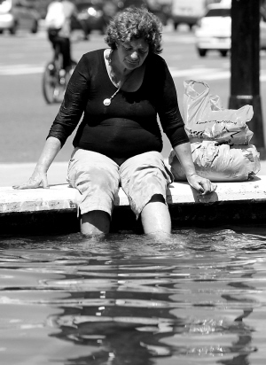 2月19日,在阿根廷首都布宜诺斯艾利斯街头,一名妇女在街头喷泉水池中消暑。当日,阿根廷首都及附近地区的最高气温达到了40摄氏度。 新华社发