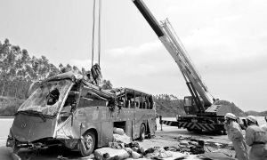 2月22日,救援人员在事故现场施救。当日凌晨,广西南宁-北海方向高速公路122公里+600米处发生一起特大车祸。截至记者发稿时,车祸已造成12人死亡。 据了解,车牌号为“贵J02462”的省际快班从贵州都匀平塘开往广东东莞。在行驶到上述路段时因紧急避让前面大货车洒落的大量麦麸,造成大客车侧翻,车辆损毁严重。新华社记者 周华 摄