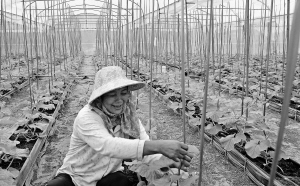 | 2月22日,陵水英州镇新坡村,王秀玉在自家大棚里固定哈密瓜的新蔓。王秀玉的2.2亩大棚哈密瓜就建在自家房前屋后,新坡村里像王秀玉家房前屋后的设施农业共有200亩。 本报记者 李英挺 摄 |