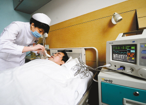 | 2月23日,在山西省人民医院,一名护士正在护理受伤的矿工张庆高。张庆高目前已暂时脱离生命危险。