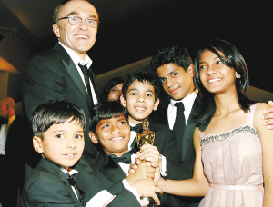 | 上图:《贫民窟的百万富翁》导演丹尼·博伊尔(后左一)和小演员们与小金人合影。 |