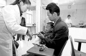 | 3岁的小聪(中)在父亲的陪伴下在澄迈县白莲中心卫生院整洁明亮的治疗室打针。 本报记者 林萌 摄 |