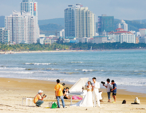 2月23日,十多对新人来到三亚湾,拍摄春天景色婚纱照。春天的三亚,天空是如此之蔚蓝,大海显得更加多情而迷人,因此吸引着无数新人涌到三亚来拍婚照。 特约记者 孙清 摄