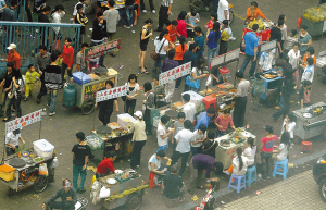 | 饮食摊点挤满街道大煞风景,“猫鼠游戏”何时终结。 本报记者 古月 摄 |