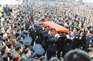 人民警察周鑫为保护群众免受伤害与歹徒进行殊死搏斗,光荣牺牲,重庆市政府决定追授周鑫“重庆市人民卫士”荣誉称号。 图为2月23日,10万市民送别英雄周鑫。 新华社发