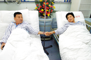 2月24日,在山东省立医院器官移植肝胆外二科病房,康复中的杨甲喜与妻子王风青相互鼓励。 山东省聊城市冠县的杨甲喜今年39岁,患有严重的肝硬化,肝脏功能衰竭,急需进行肝脏移植手术。其妻王风青经过化验与丈夫配型成功,于2月13日在山东省立医院进行肝移植手术,将三分之二的肝脏捐献给杨甲喜。目前,两人均已度过了危险期,身体各项指标正常。 新华社发