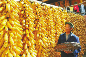 | 云南农民赵有能高兴地看着院里金灿灿的玉米。 |