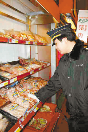 | 上海市食品药品监督管理局的工作人员在一家超市内检查肉制品。 |