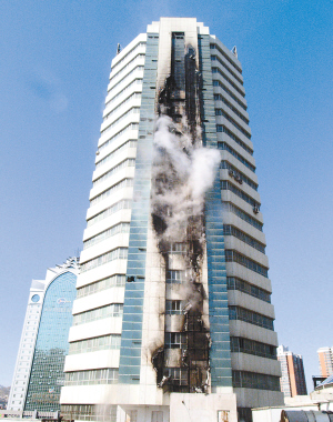 乌鲁木齐 国贸大厦大火扑灭 经过消防官兵的奋力扑救,发生于3月2日15时20分许的乌鲁木齐国贸大厦火灾于当日16时14分被迅速扑灭,火灾没有造成人员伤亡。 新华社发