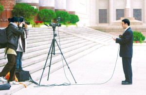 | ↑在人民大会堂前,首次采访中国两会、来自西班牙国际经济集团的电视记者韦加以一抵四,既当摄像,又要出镜。他告诉我们,写稿、编片也是他回去后的工作。