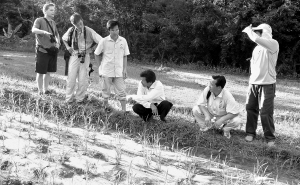 | 专家们正在观察水稻覆膜后生长情况。 本报记者 苏晓杰 摄 |