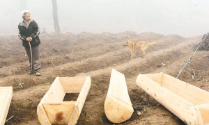 3月3日,一位老人悲痛地看着为遇害村民准备的棺木。 新华社发