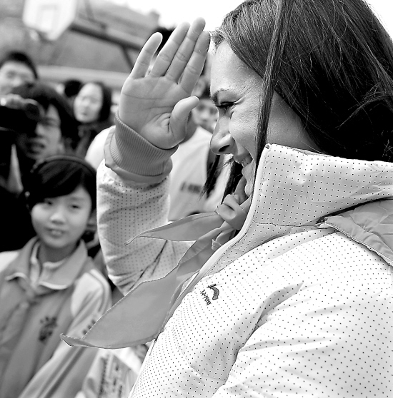 3月3日,俄罗斯著名女子撑杆跳运动员伊辛巴耶娃来到北京史家小学做客。图为伊娃向学生们敬队礼。 新华社发