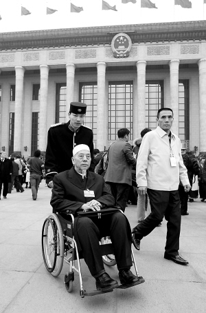↑3月3日,全国政协十一届二次会议开幕式结束后,友谊宾馆的一位服务员推着来自新疆的全国政协委员马寿新走出会堂。