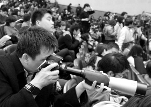 ←3月3日,全国政协十一届二次会议开幕式上,一位男士拿着由望远镜和单反数码机身组合的新式装备观看开幕式。
