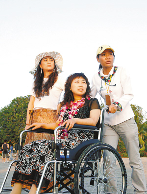 本报三亚3月4日电 (记者张谯星)“我又回来看天涯海角了!”今天傍晚,在烂漫的烟花中,北川“锯腿女子”龚天秀坐着轮椅,带着心愿重返天涯海角。