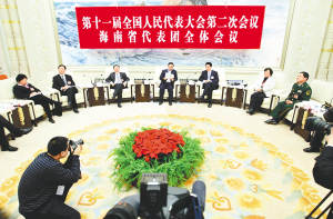 | 3月6日,出席十一届全国人大二次会议的海南代表团在人民大会堂海南厅举行开放日活动。境内外45家媒体的66位记者采访海南团。