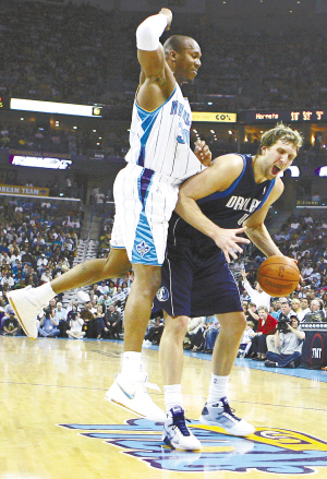 3月6日,在NBA常规赛中,新奥尔良黄蜂队主场以104:88战胜达拉斯小牛队。图为黄蜂队球员韦斯特(左)在防守小牛队球员诺维茨基。 新华社发