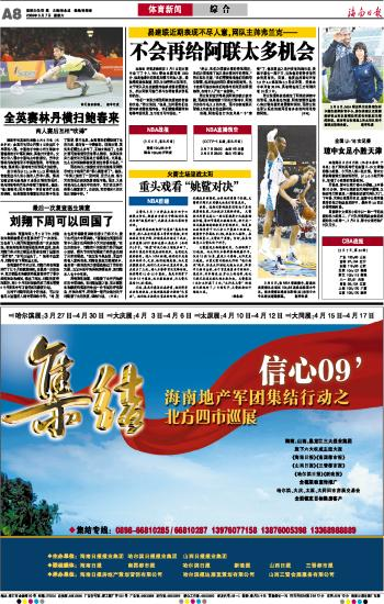 海南日报 体育新闻 008 2009-03-071 2009年03月07日 星期六