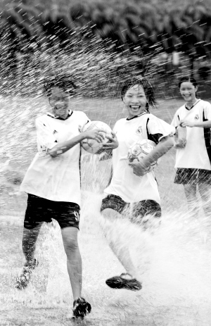 | 训练之余,琼中女足队员打水仗,辛苦中也有快乐。本报记者王凯摄 |