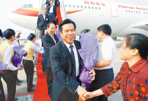 省委常委、秘书长许俊,省人大常委会副主任毕志强,副省长符跃兰,省政协副主席张海国等到机场迎接返琼的我省全国政协委员。