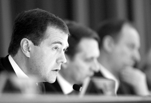 俄罗斯总统德米特里·梅德韦杰夫(左一)17日在国防部一次会议上说,俄罗斯将重整军备,加强核力量,以应对美国主导的北大西洋公约组织向俄边界扩张。