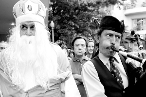 3月17日,在阿根廷首都布宜诺斯艾利斯,一名风笛手和另一名装扮成圣帕特里克的男子参加游行,庆祝圣帕特里克节。圣帕特里克节是爱尔兰人纪念爱尔兰守护神圣帕特里克的节日,至今已有1500多年历史。 新华社/法新