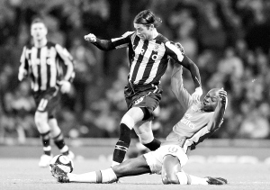 3月18日,在英格兰足总杯四分之一决赛中,阿森纳队主场以2比1战胜赫尔城队,晋级半决赛。图为阿森纳队球员加拉斯(下)与赫尔城队球员哈尔莫西拼抢。 新华社发