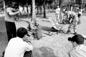 | 在武警海南总队,两名战士在进行卫星背负战演练时吸引数名网友拍摄。 南海网记者 张茂 摄 |