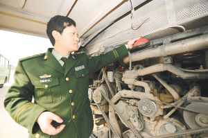 3月19日,一名消防官兵在检查灭火器。 在贵阳市消防支队的指导下,贵阳市公交部门近日为全市首批370辆公交车安装上干粉自动灭火装置,该装置安装在发动机机舱内,一旦着火就会立刻自动扑火。 新华社发