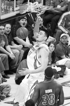 姚明(上)在活塞内线球员的封堵下强行扣篮。 新华社发
