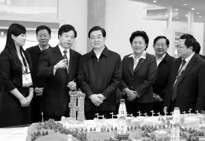 | 胡锦涛在中国石油天然气集团公司上下游一体化节能减排技术示意模型前,详细了解技术原理和节能减排情况。 新华社发 |