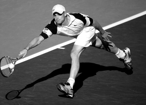 | 3月21日,在印第安韦尔斯网球公开赛男子单打四分之一决赛中,美国选手罗迪克以2比0战胜塞尔维亚选手德约科维奇,晋级半决赛。图为罗迪克在比赛中救球。