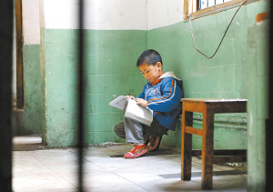 ↑ 一名小学生在过道里读书。