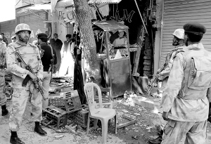 巴基斯坦 奎达果汁店遭到炸弹袭击 3月24日,在巴基斯坦的奎达,一些士兵在发生炸弹袭击事件的果汁店外警戒。当天,巴基斯坦西南部奎达的一间果汁店发生炸弹袭击事件,造成至少4人受伤。 新华社/法新