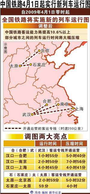 据新华社北京3月24日电(记者齐中熙)铁道部副总工程师、运输局局长张曙光24日宣布,自2009年4月1日零时起,全国铁路将实施新的列车运行图,这是继2007年4月18日第六次大面积提速调图之后,铁道部再次对列车运行图进行较大范围的调整。