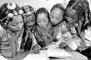 | ←3月26日,昌都地区实验小学学生嘎松曲西(中)与同学们一起念课文。