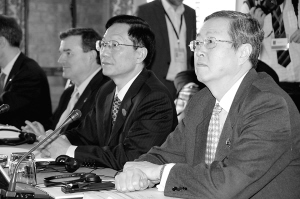 | 3月14日,中国财政部长谢旭人(右二)和中国人民银行行长周小川(右)在英国出席20国集团财政部长和央行行长会议。当天,20国集团财政部长和央行行长会议在伦敦以南约50公里的霍舍姆饭店开幕,为4月初的伦敦金融峰会做准备。 新华社资料照片 |