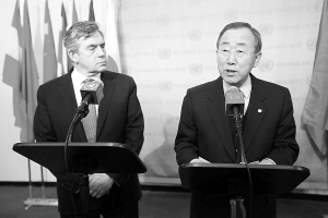 3月25日,联合国秘书长潘基文(右)与到访的英国首相布朗在美国纽约联合国总部举行联合记者招待会。他们表示,国际社会应尽快采取行动,有效应对当前全球金融危机所带来的挑战。他们希望将于4月2日在伦敦举行的二十国集团金融峰会能够在处理当前金融危机、帮助发展中国家发展经济、改革当前的国际金融机构等方面取得成功。 新华社/路透