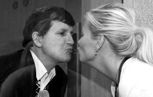 | 3月25日,在哈萨克斯坦拜科努尔发射场,“太空游客”、美国富翁西蒙尼隔着玻璃窗与妻子吻别。