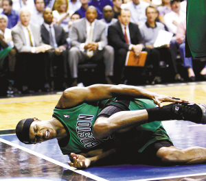 3月25日在NBA常规赛中,魔术队主场以84:82战胜凯尔特人队。图为凯尔特人队球员隆多在比赛中倒地。新华社发