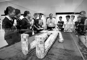 | ↑ 3月26日,省博物馆展厅内,中国国家博物馆工作人员在给省博物馆讲解员介绍文物“金缕玉衣”的相关知识。 |