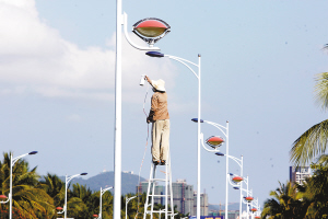 3月26日下午,市政工作人员在粉刷路灯杆。为了迎接今年博鳌亚洲论坛,三亚市启动了环境整治工作,包括刷新市政设施、整治街道等等。 本报记者 程范淦 摄