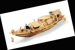 不要小看这件小小的模型,真可谓“麻雀虽小五脏俱全”,船锚栓系在船头,船头两边分别插有三根桨架。船两旁为撑篙的走道。船分前、中、后三舱,均有蓬盖。前舱适合用做货舱。中舱比前舱稍高,屋呈方形,两侧各开一门以供人出入。后舱为舵楼,最高,便于舵手鸟瞰前方,操掌航向。后舱右侧附有一间小房,推测是船上的“洗手间”。船舱里还设置横木“梁担”,可使船身骨干坚实,吃水深,负重大,行驶平稳。