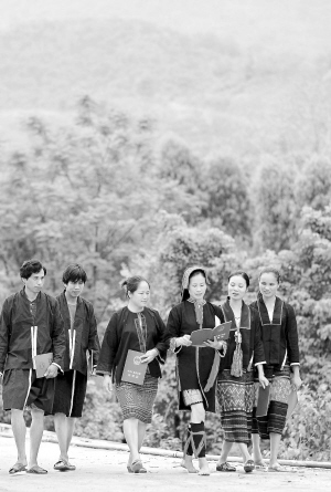 | 昌江七叉镇宝山村河边,当地黎族、苗族村民手捧《林权证》,一路交谈。 海南日报记者 张杰 摄