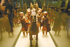 →省博物馆展厅里的杨家湾汉墓兵马俑 海南日报记者 宋国强 摄